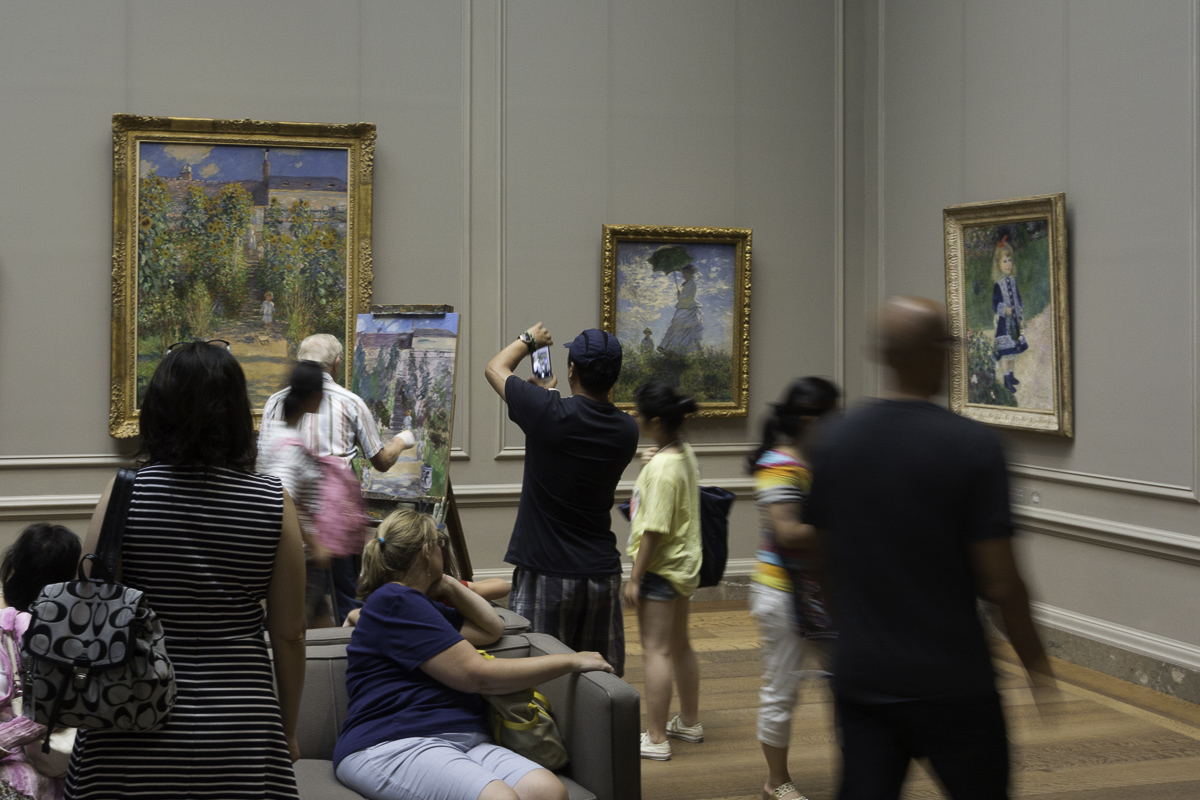 Our long-delayed visit to the west end of the mall complete, we were again on the Circulator for a final stop at our favorite spot on the Mall. The National Gallery of Art always has new exhibits, plus our beloved gallery of impressionist paintings. As usual, many hurry through taking snapshots without really seeing, and a few settle on the sofas and really see the art.